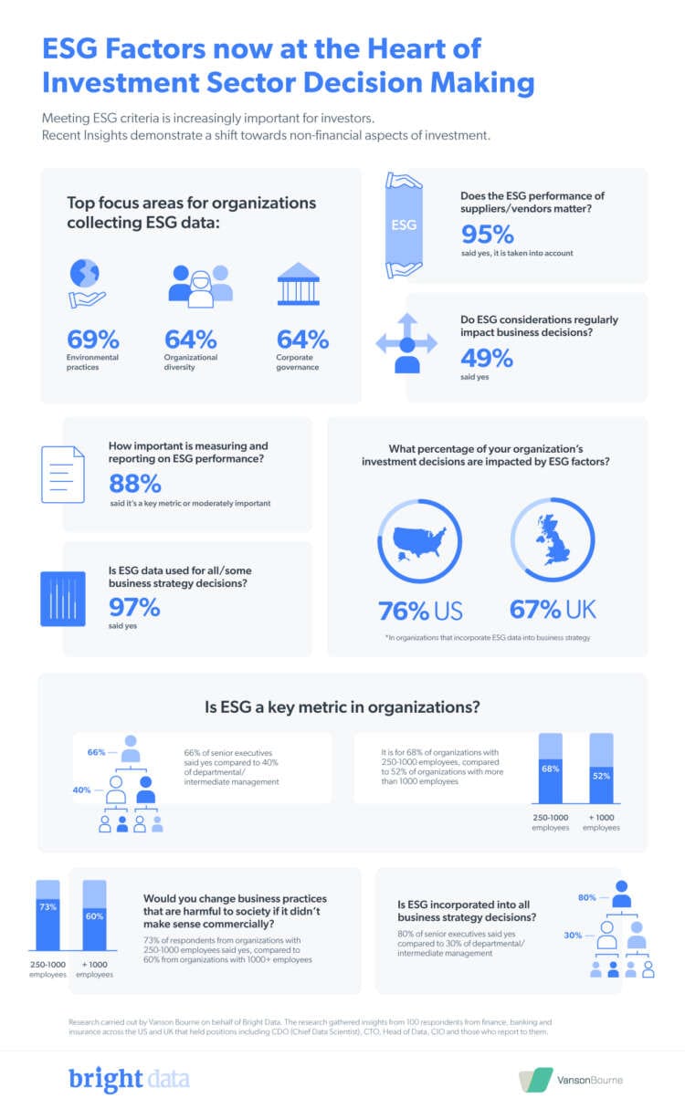 Bright Data (formerly Luminati Networks), a leading online data collection platform, has today released new research findings that underscore the importance of ESG considerations in investing and demonstrate the importance organizations place on environmental and social impact when doing business. The research, carried out by research provider Vanson Bourne, highlighted US survey respondents from within the finance, banking and insurance sectors who said that just over three-quarters (76%) of their organization’s investment decisions are impacted by ESG factors, whereas for UK respondents it’s 67%.