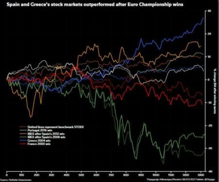 Of the last five tournament winners, Greece and Spain’s bourses outperformed the pan-European STOXX 600 after their 2004 and 2008 and 2012 wins, while only Portugal’s 2016 title was followed by notable underperformance.